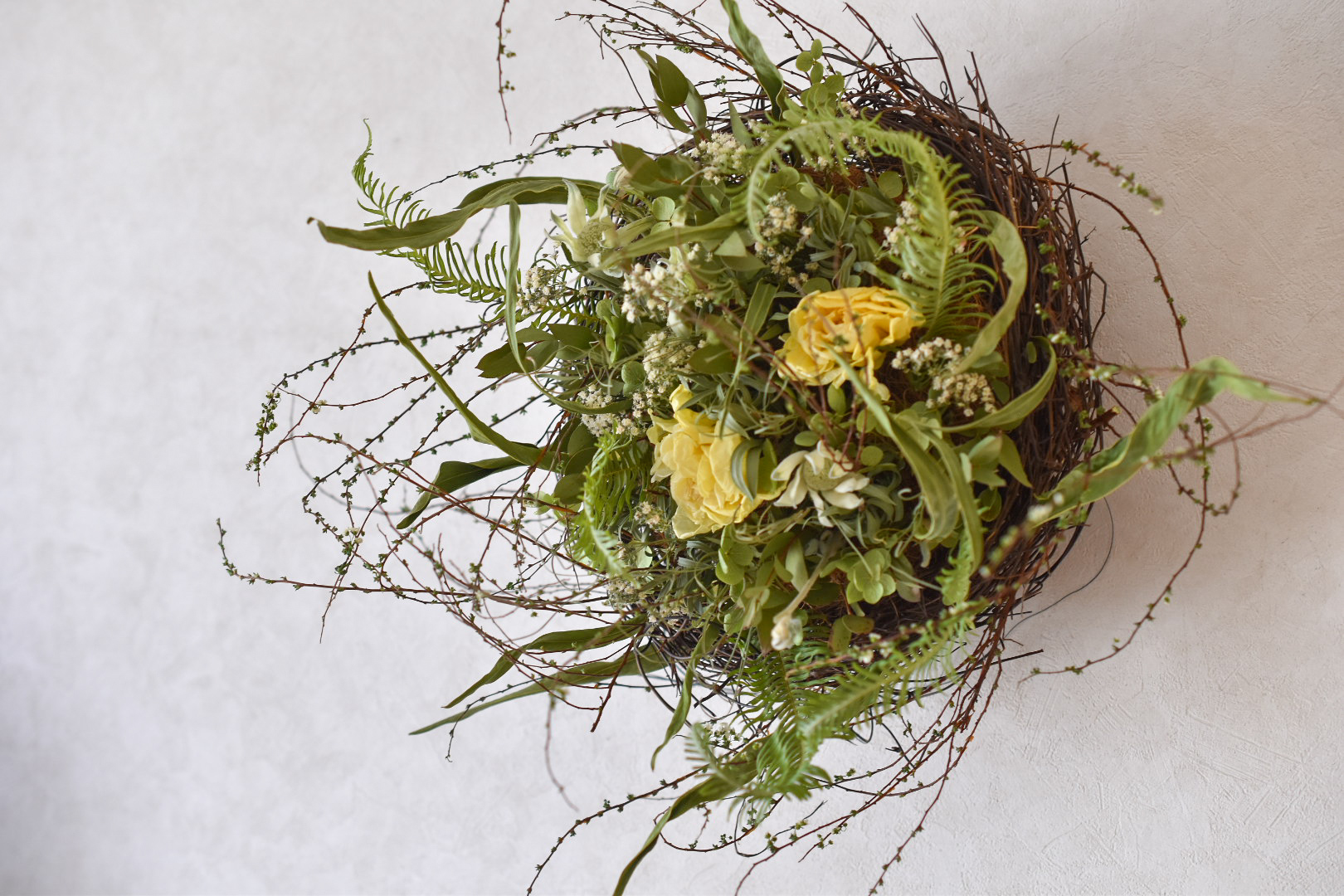 花束は、春の訪れを知らせるミモザと雪柳や姫ゼンマイなどの春の草花を、そっと束ねます。壁飾りでも花瓶に入れても楽しめます。